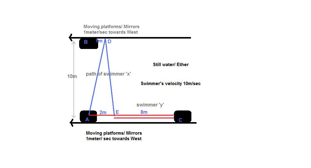 Platforms A, B, and C represent the mirrors in the MM experiment – let me remind you that they are fixed relative to each other. Hence if the velocity of ‘swimmer Y’ is 10m/sec with respect to platform A, that remains the same even with respect to platform C.