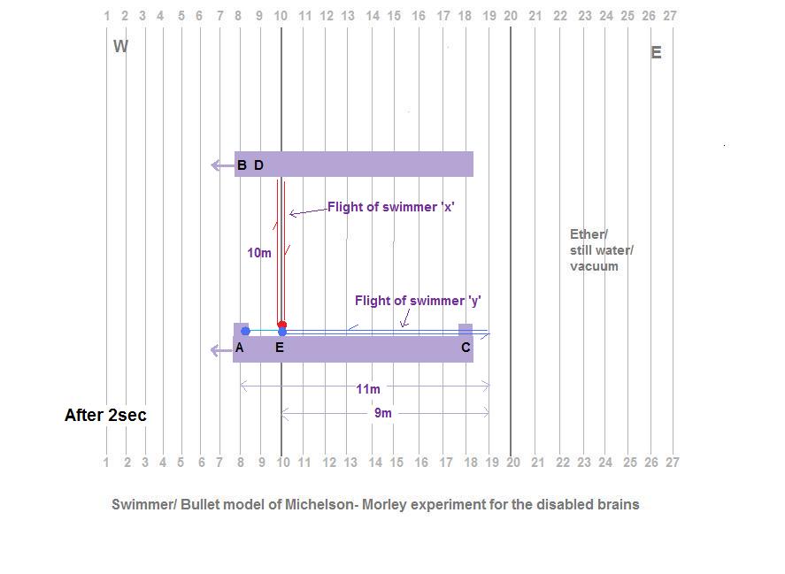 One more thing to note is that swimmers X and Y here represent light photons. Because your witch theory of relativity proposes that speed of light is constant to all observers, the speed of swimmer Y should remain 10m/sec with respect to platform C whether it moves or not. After all this, don’t argue that swimmers can’t represent light photons – your own masters of the witch theory have done that already.